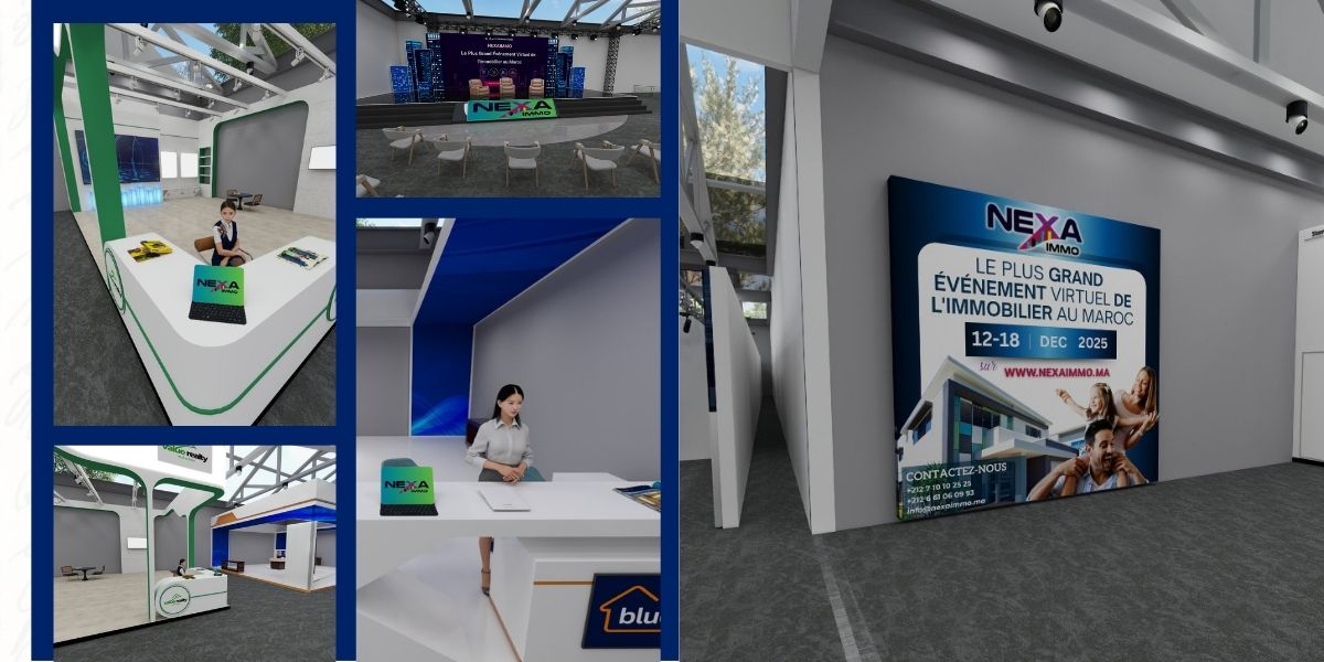 Ce projet présente la création d’un salon immobilier virtuel entièrement immersif pour Neximmo, un événement majeur du secteur. Notre objectif était de reproduire l’expérience d’un salon professionnel physique, en permettant aux promoteurs de présenter leurs biens dans des stands virtuels conçus sur mesure. Cette plateforme innovante permet aux visiteurs d’explorer une large gamme de propriétés, d’interagir avec les exposants et d’assister à des présentations depuis le confort de leur foyer, connectant ainsi efficacement l’immobilier marocain au monde entier.